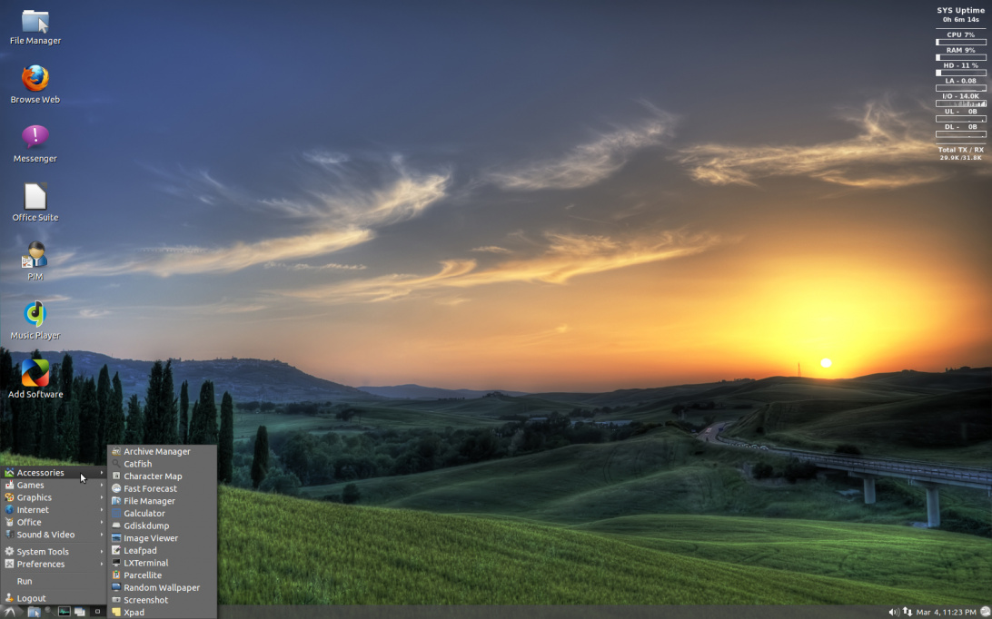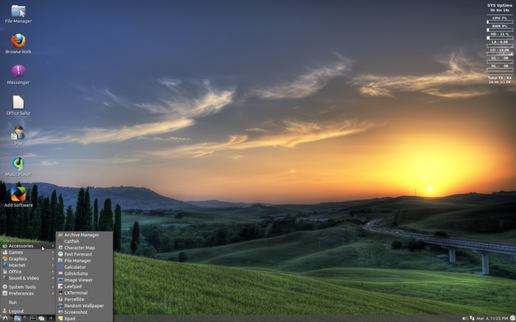 虽然 LXLE 基于 LXDE 桌面,但是 LXLE 比默认的 LXDE 颜值高许多。系统内置了上百张美丽的桌面壁纸任你选择。更有 Aero 特效、快速启动栏、随机壁纸、回收站托盘等诸多特性供你体验。