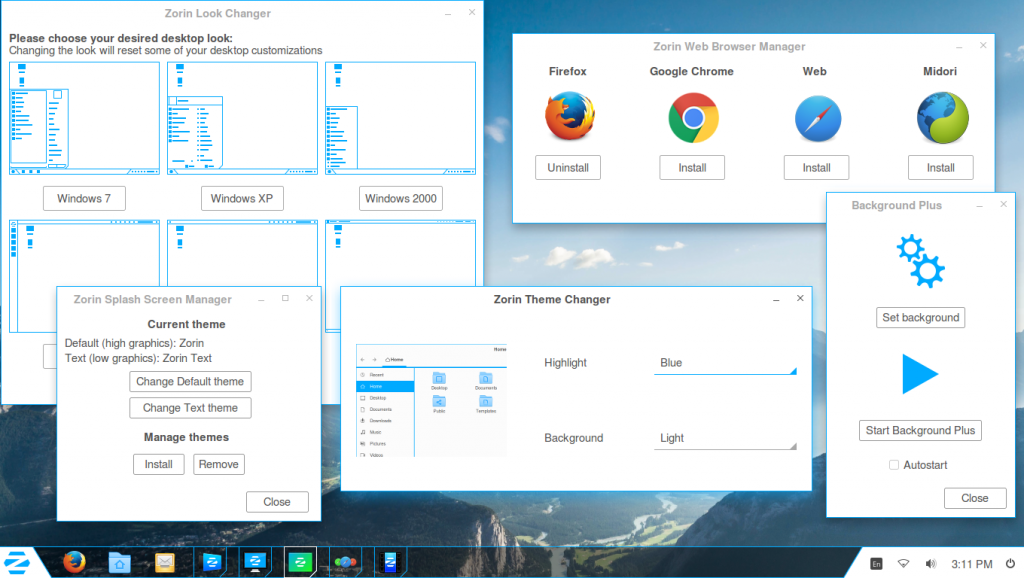 Zorin OS 使用自己的桌面环境。你可以任意切换主题,支持: Windows 7 ( Zorin OS Core )、 Windows XP ( Zorin OS Core )、 Windows 2000 ( Zorin OS Premium )、 Ubuntu Unity ( Zorin OS Premium )、 MacOSX ( Zorin OS Premium )、 GNOME 2 ( Zorin OS Premium )。