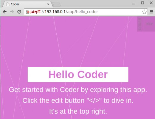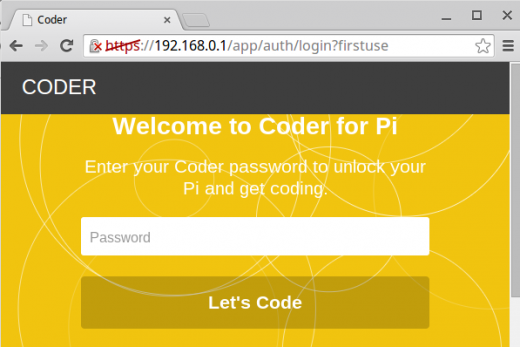Coder 为我们提供了有线和无线 WiFi 两种接入方式,这里笔者通过第二种方式用自己的笔记本访问树莓派。当然第二种方式需要给你的树莓派配备无线模块,Coder 会自动建立一个名为 “CoderConfig” 的无线信号。接入无线后只需在笔记本上打开浏览器(这里以Chrome为例),并且在地址栏中键入: