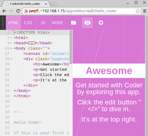 初次上手推荐选择页面右上方的 Hello Coder 项目。点击后进入项目入口,根据提示点击页面右上角 "</>" 可以进入编辑窗口,在编辑窗口我们可以对事例程序进行查看和修改,所有的修改都是所见即所得的。新手可以依次浏览编辑页面的几个标签页,做一些简单的修改,从而最直观的认识 Web编程。