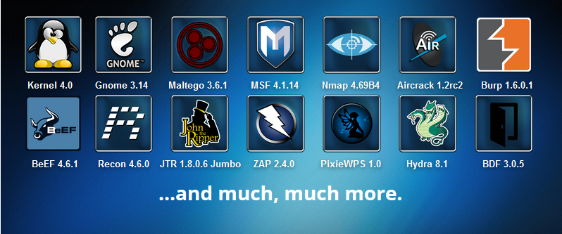 那么,Kali 2.0有哪些更新? Kali2.0将内核更新至2.0,基于Debian Jessie,改善了硬件和无线驱动的适配,可适应各种桌面环境(GNOME,KDE,XFCE,mate,E17,LXDE,i3wm),桌面环境和工 具支持都得到了更新 - 这样的例子不胜枚举。但这些都不是我们开发的重点。准备好听重点了么 ?深呼吸,这是一个长长的名单 。