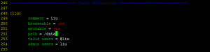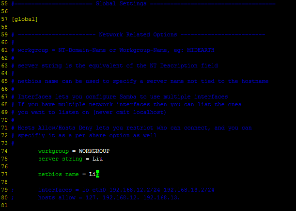 其中左上角的 [liu] 是你以後訪問要用到的。這裡要注意的就是許可權的問題,由於是我自己使用,所以我默認的擁有全部許可權。z這裡只是配置了文件共享,還可以配置列印共享等等。具體生產環境還需要對每個用戶的訪問進行限制,對用戶的讀寫許可權進行控制。配置文件里具體的寫法和描述都比較全面。在這裡就不進行贅述了。