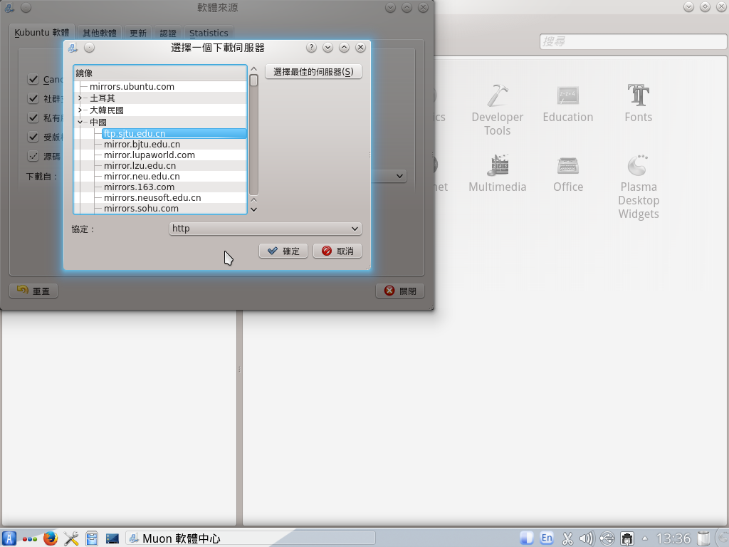 从ezgo Menu中选择系统-软体(件)中心,在软件中心的菜单中选择软体(件)来源,将下载伺服器(服务器)改为中国地区的服务器(如ftp.sjtu.edu.cn),确定并稍等片刻即可。
