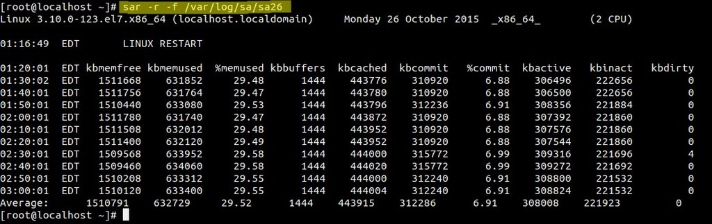 [root@localhost ~]# sar -r -f /var/log/sa/sa26