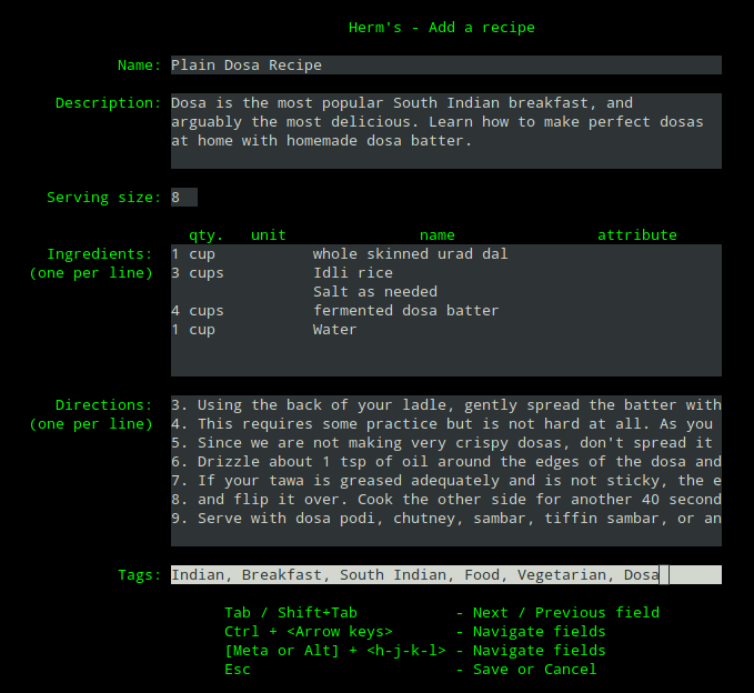 让我们添加一个食谱,例如 Dosa。对于那些想知道的,Dosa 是一种受欢迎的南印度食物,配以 sambar(LCTT 译注:扁豆和酸豆炖菜,像咖喱汤) 和酸辣酱。这是一种健康的,可以说是最美味的食物。它不含添加的糖或饱和脂肪。制作一个也很容易。有几种不同的 Dosas,在我们家中最常见的是 Plain Dosa。