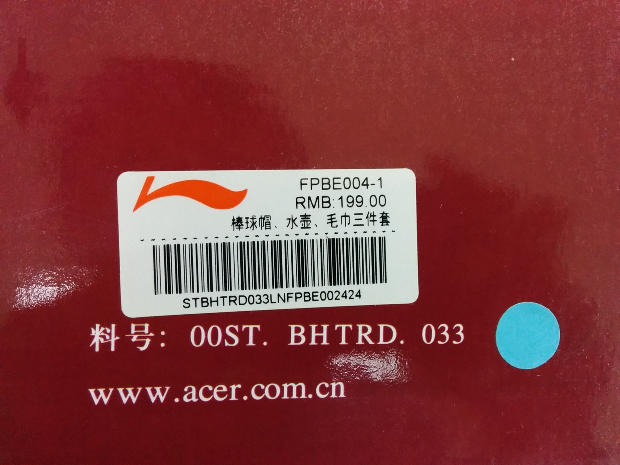 - 李宁 & 宏碁联合品牌夏季三件套。Acer 定制李宁热款棒球帽、毛巾和大容量水杯。价值199元。