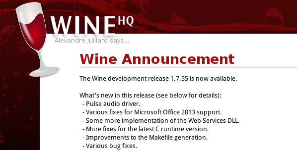 Wine发布1.7.55,这一版本加入了PulseAudio驱动,修复了MS Office 2013支持,对Web Services DLL加入了更多实现,修复了最新版本的C运行环境,提高了Makefile生成效率。