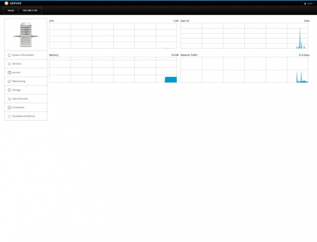 当我们查看一台独立的服务器时,Cockpit 面板的主页为我们显示了 CPU、内存、硬盘读写以及网络流量。