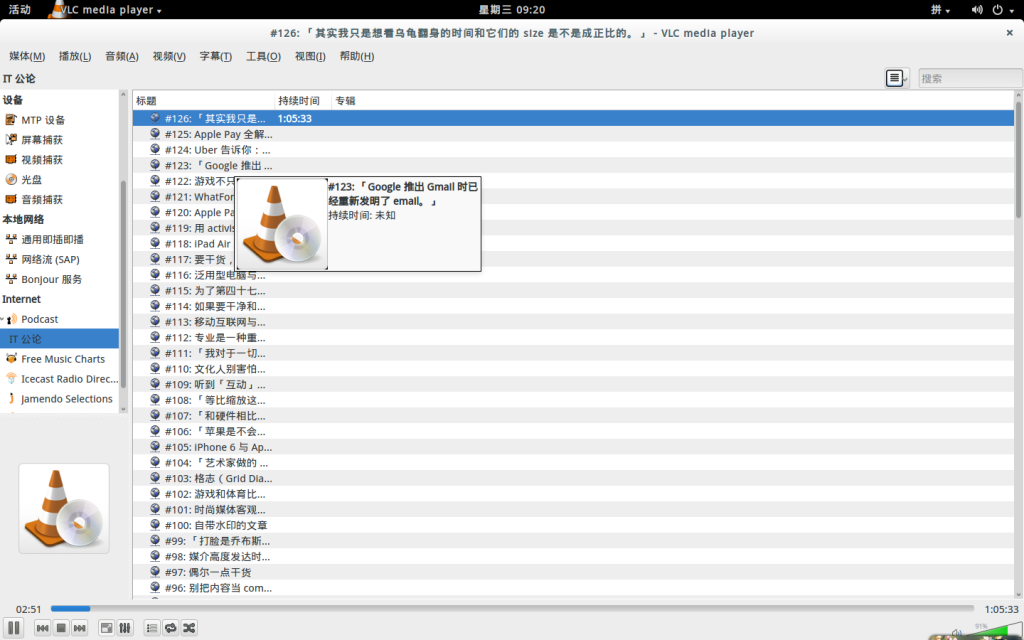 Podcast,一种语音节目的形式,类似传统的 AM / FM 电台,但分发和获取形式更加自由,可以以通过 RSS 技术订阅,在各大操作系统平台都有受欢迎的客户端。随着智能终端的兴起播客再次红火,功能强大的VLC其实还是一款播客管理软件,通过VLC订阅播客我们需要相应节目的RSS地址,这里拿“IT公论”来示范一下: