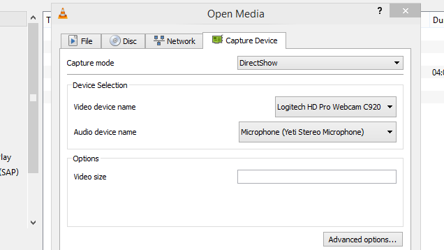 - 选中 捕获模式 菜单中的DirectShow 选项