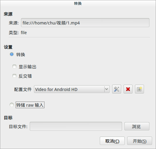 - 在目标选项中选定 录制视频的文件名和存放路径